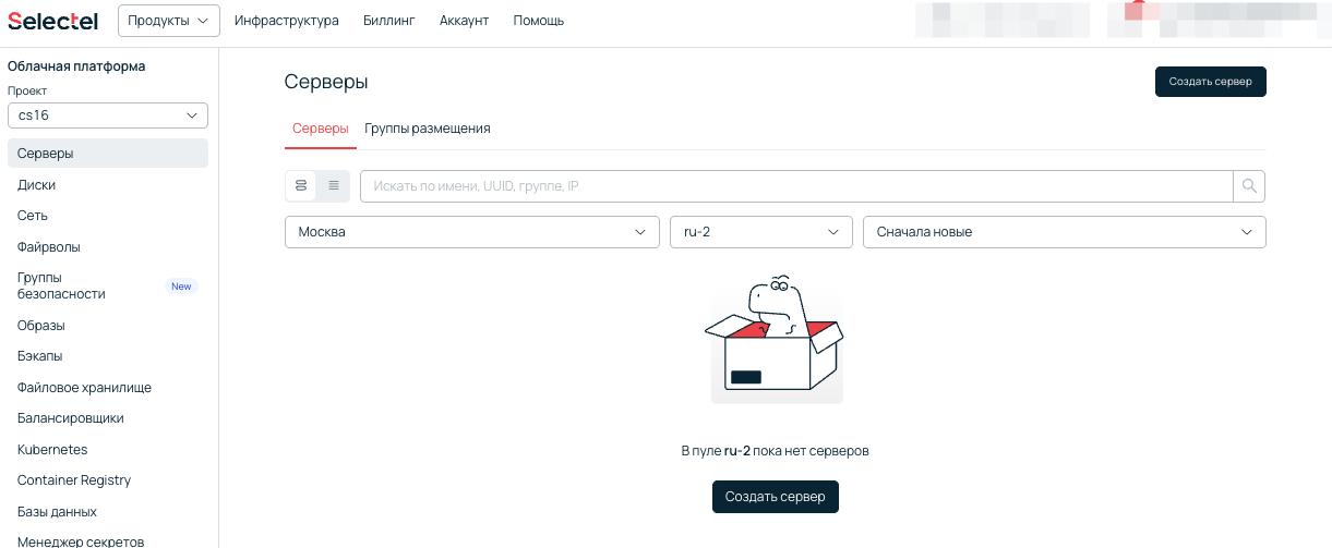 Найдем в шапке Продукты → Облачные серверы и создадим новый сервер.