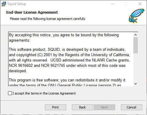 Дальше читаем и принимаем соглашение. Нажимаем Next. Выбираем директорию для установки Squid: