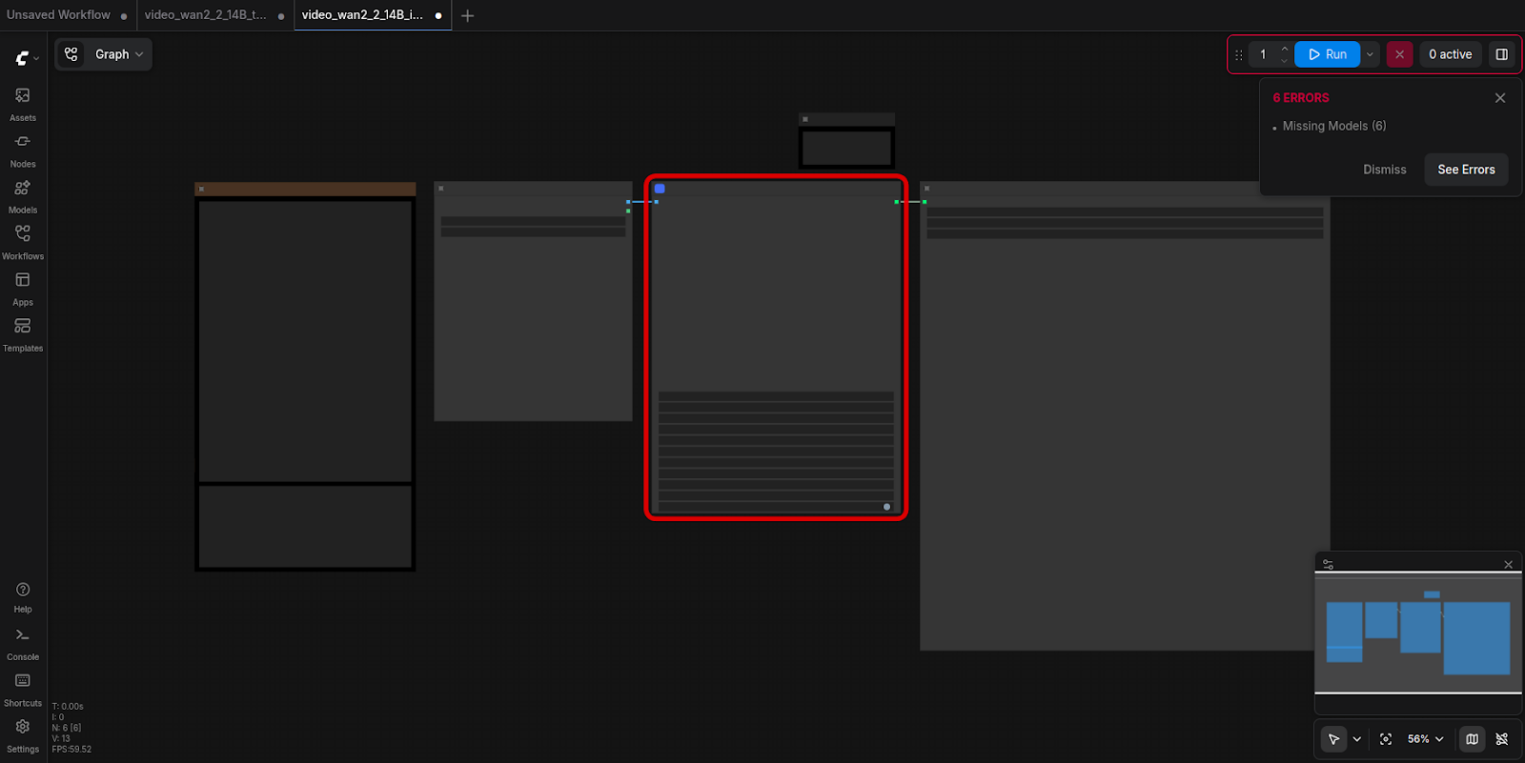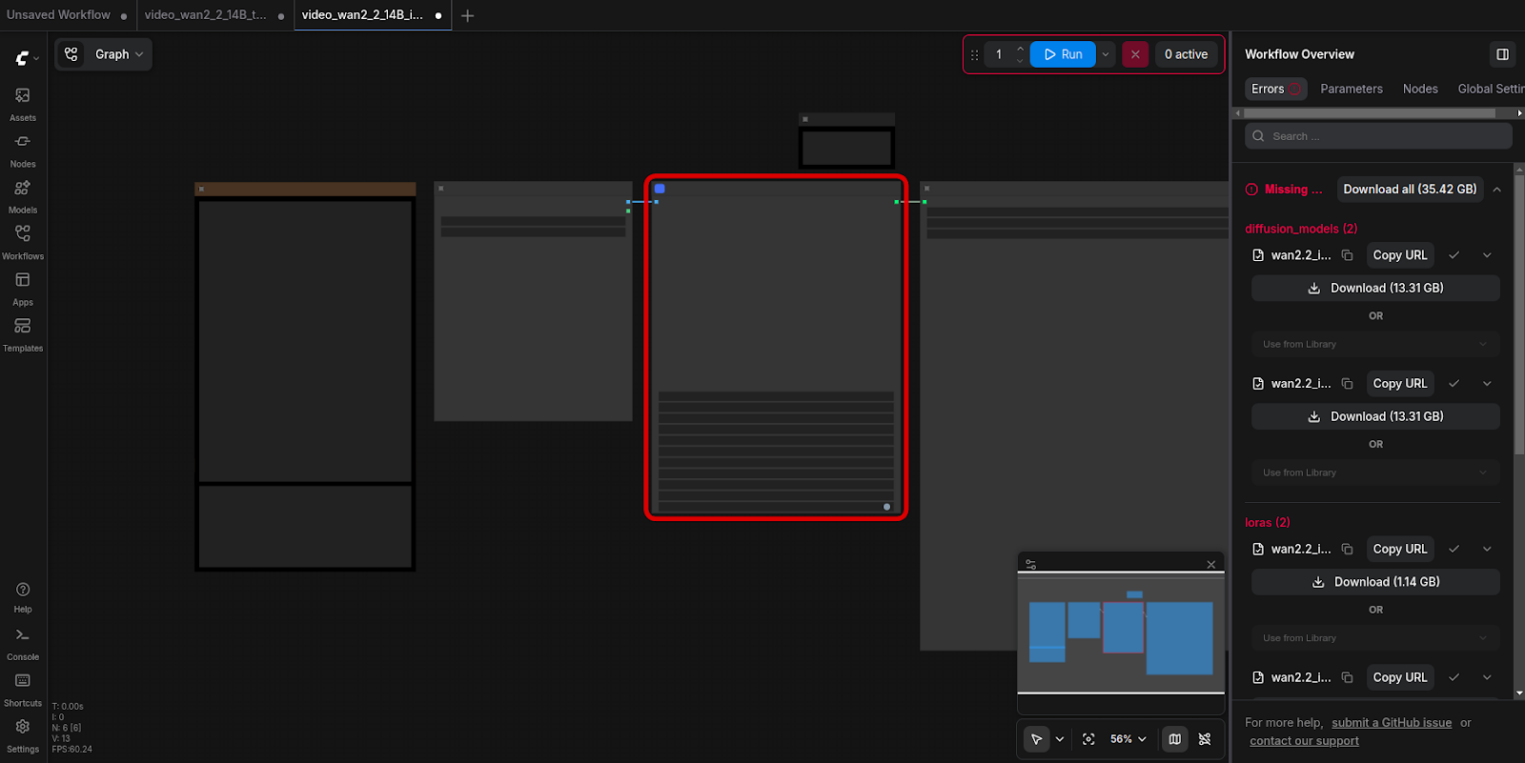 Появится ошибка о том, что файлы отсутствуют. Нажимаем See errors и в появившемся окне ComfyUI покажет, чего не хватает. В случае с Wan 2.2 ComfyUI показывает ссылки, по которым можно скачать модели, но он не делает это за нас.