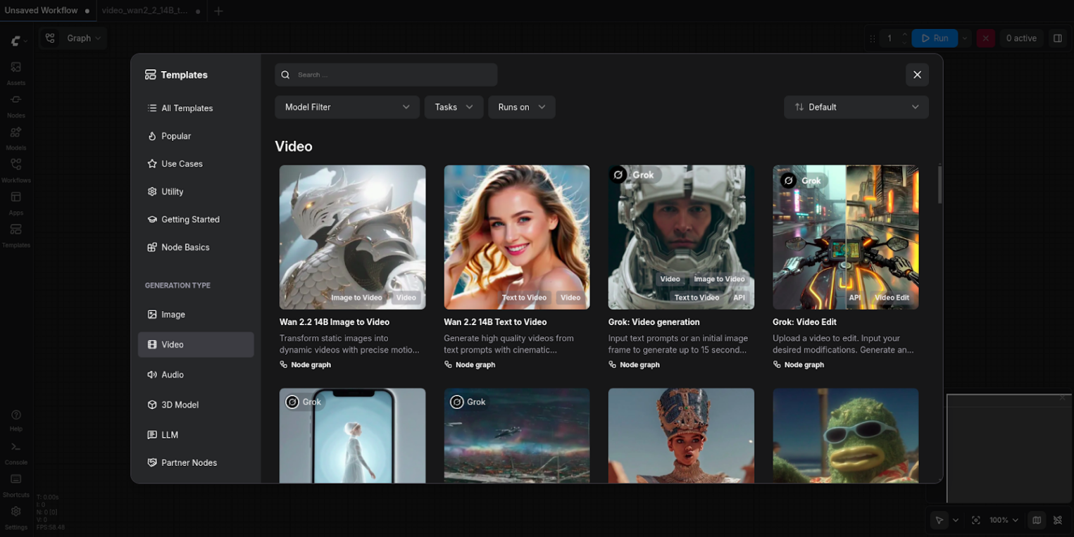 При первом старте ComfyUI предлагает шаблон, с которого можно начать. На вкладке Video выбираем Wan-2.2. Однако это лишь шаблон, самих моделей, которые выполняют полезную деятельность, на сервере еще нет.
