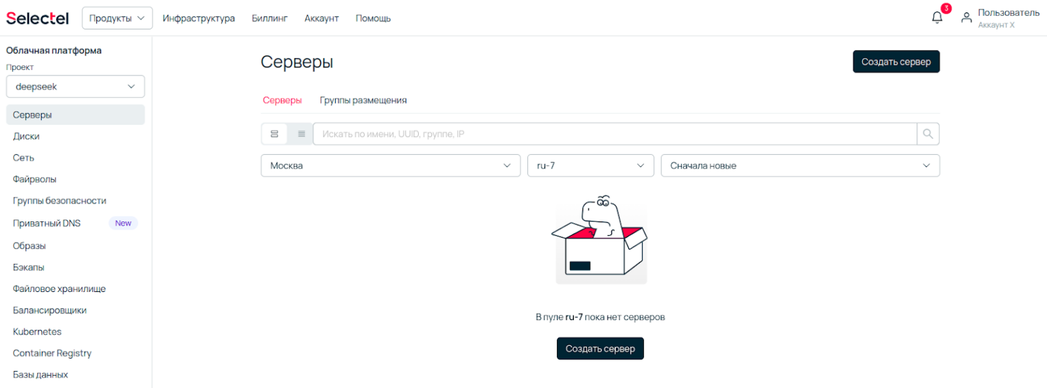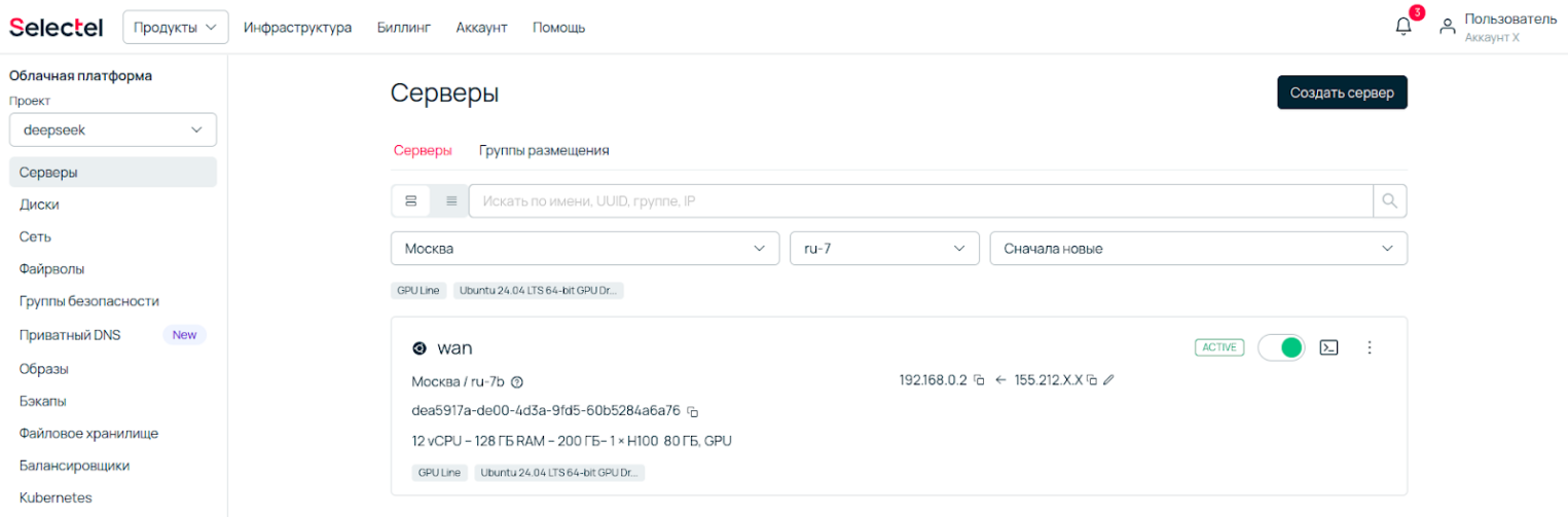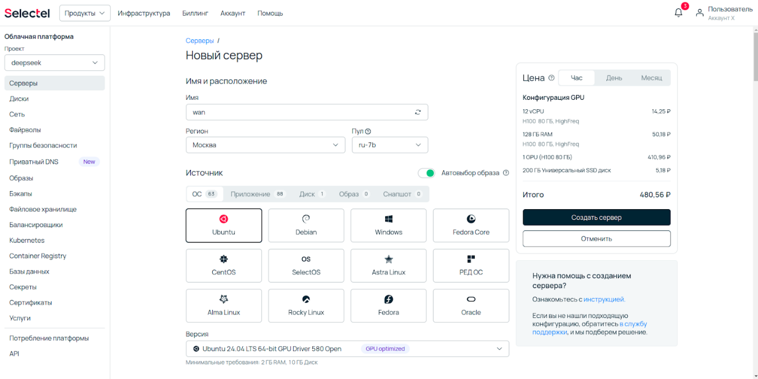 Будем использовать «богатую» конфигурацию облачного сервера с видеокартой H100 (80 ГБ VRAM). Для запуска воспользуемся облачной платформой.