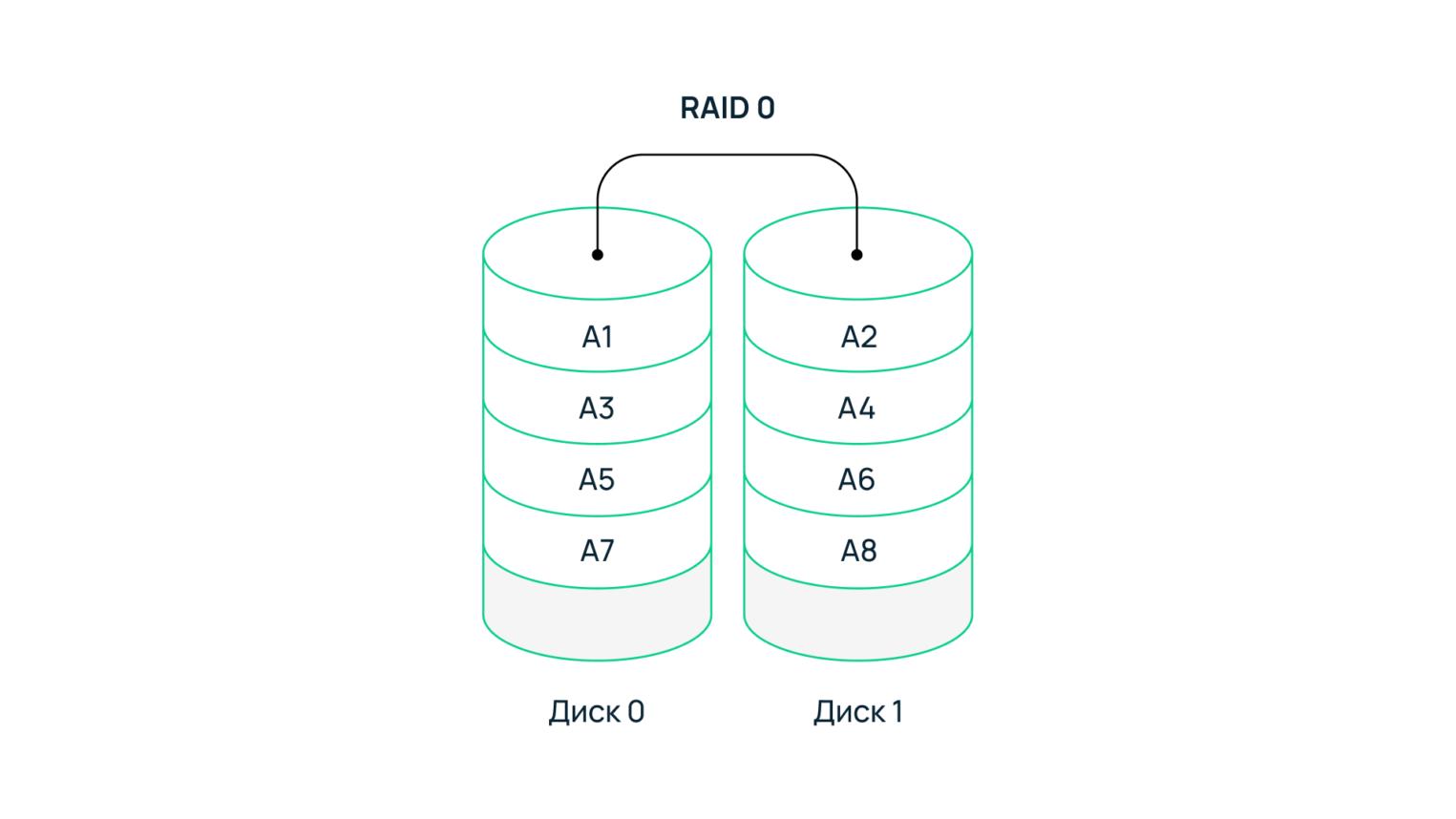 RAID 0 (Striping) — самый простой и быстрый уровень, при котором данные распределяются по блокам между несколькими дисками. Такой подход повышает скорость чтения и записи за счет параллельной работы всех дисков в массиве. Однако RAID 0 не обеспечивает отказоустойчивости: при выходе из строя любого диска теряется весь массив.