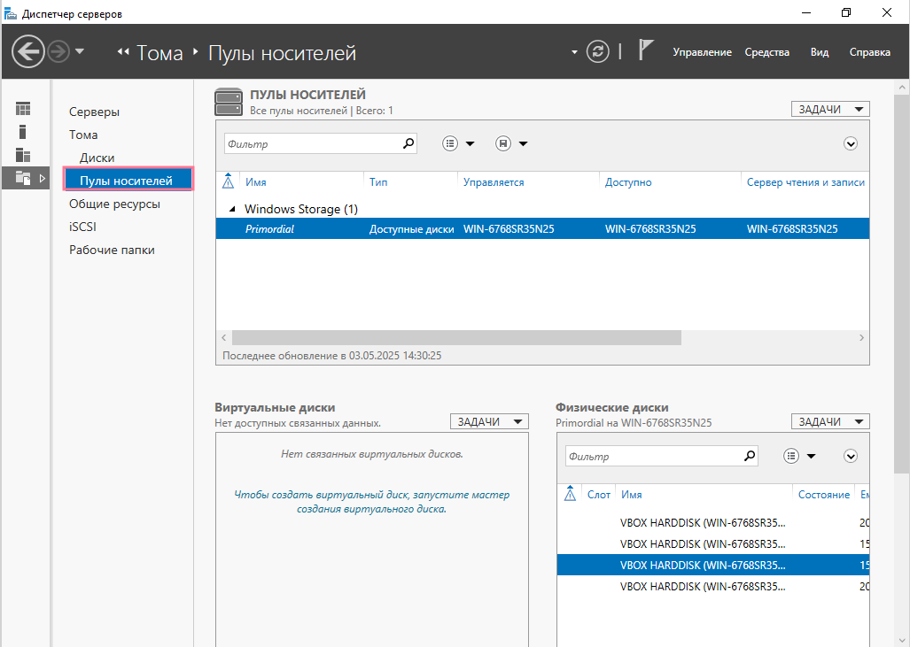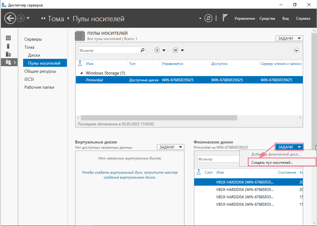 Откройте диспетчер серверов. Перейдите в раздел Файловые службы и службы хранилища → Пулы носителей.