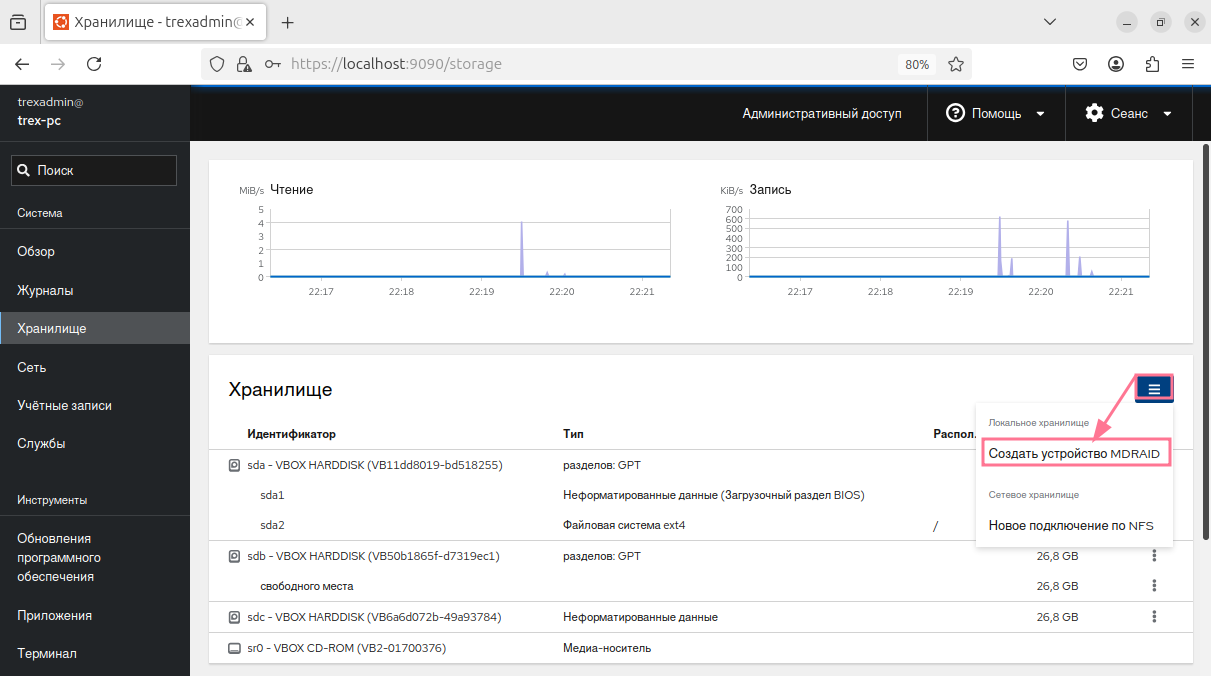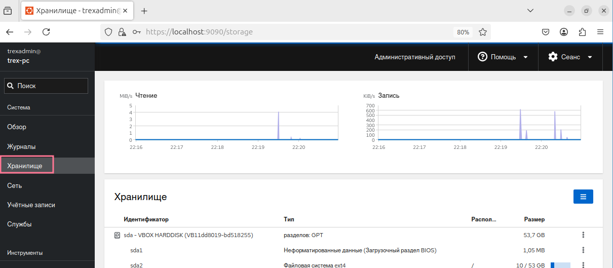 - Перейдите в раздел Хранилище в интерфейсе Cockpit.