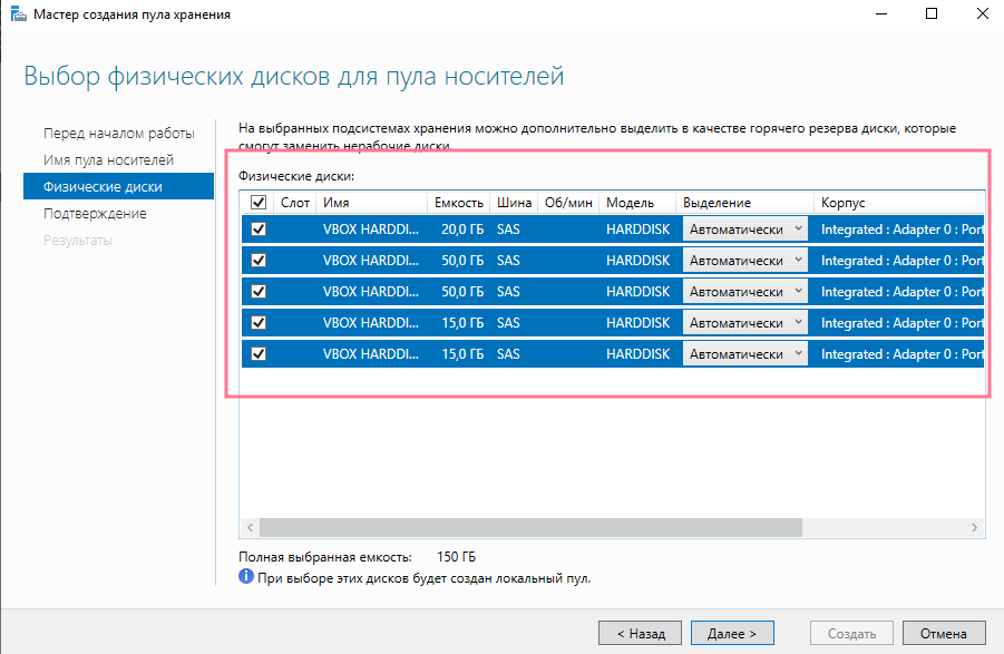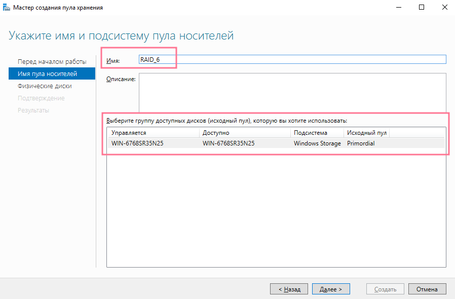 - Выберите диски, которые войдут в состав пула. Для создания RAID 0 и RAID 1 достаточно двух дисков, для создания RAID 5 – минимум трех, а для RAID 6 – минимум четырех: