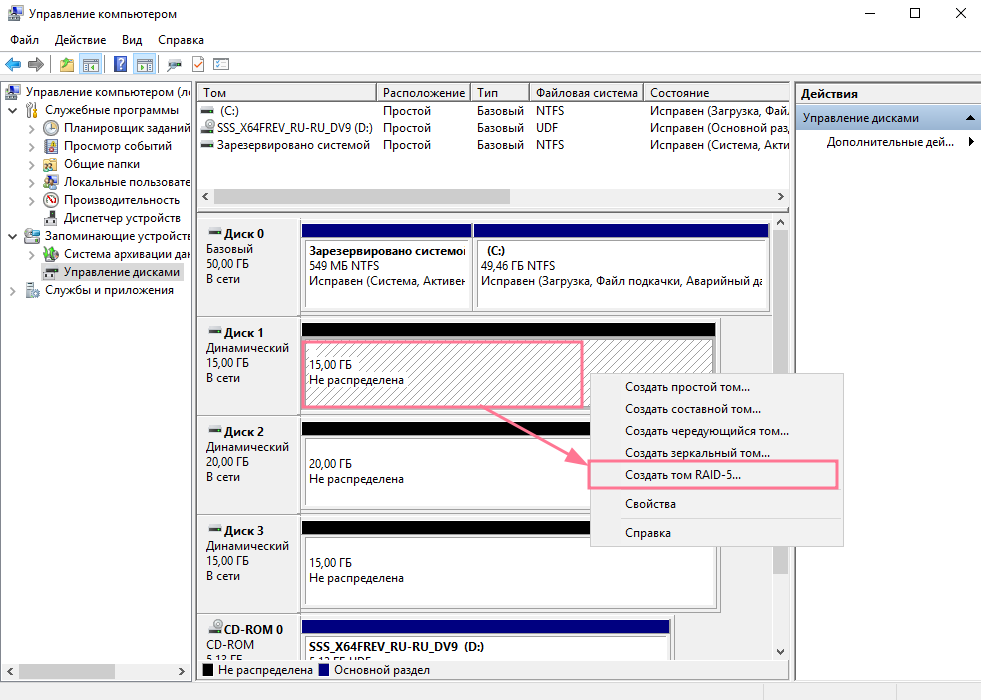 Для создания RAID 0 и RAID 1 достаточно двух дисков, а для создания RAID 5 – минимум трех.