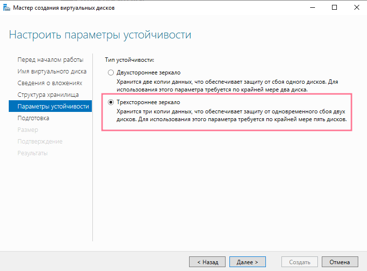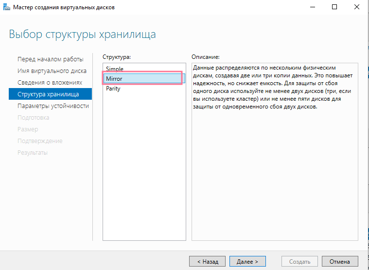 Дисковые пространства — это продвинутый механизм виртуализации хранилища, позволяющий объединять физические диски в отказоустойчивые пулы с поддержкой разных уровней устойчивости (зеркалирование, parity и др.)