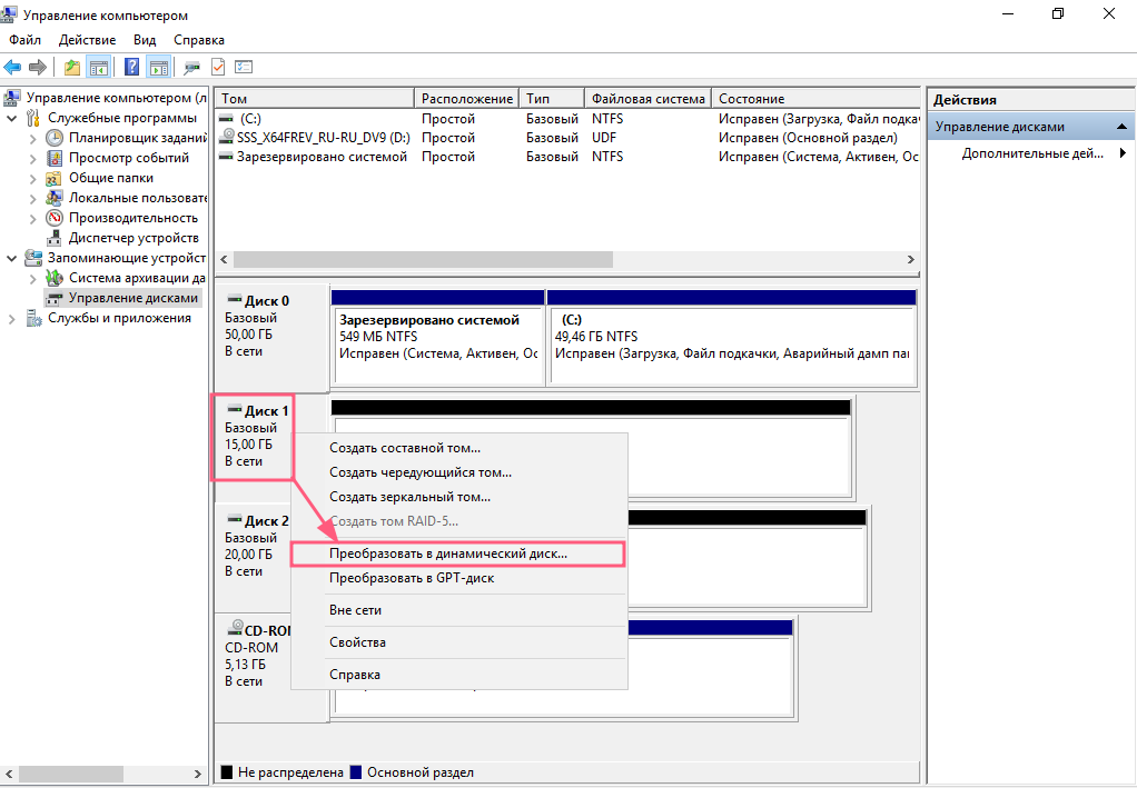 Если диск отображается как «Базовый», нажмите по каждому правой кнопкой мыши (ПКМ) и выберите Преобразовать в динамический диск.