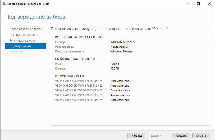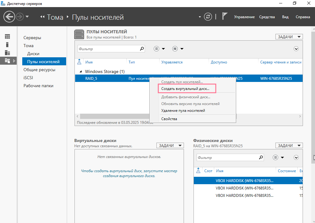 Затем нажмите ПКМ на созданном пуле и выберите Создать виртуальный диск….