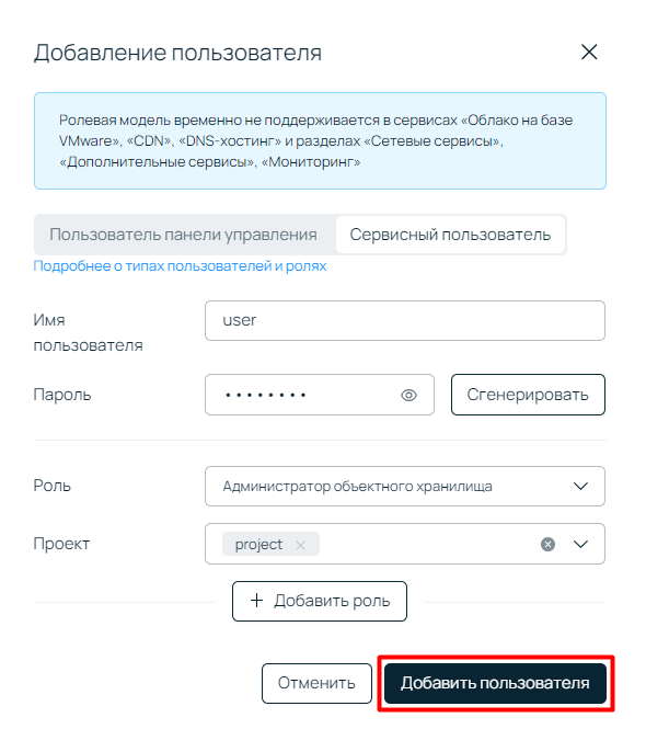 В параметрах при добавлении пользователя указываем роль Администратор объектного хранилища и проект облачной платформы, в котором находится наш контейнер. И затем нажимаем на кнопку Добавить пользователя.