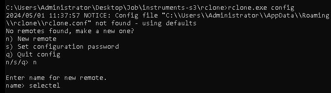 При первом запуске программы вам предложат создать конфигурационный файл. Вводим n для выбора New remote — создания новой конфигурации, и указываем наименование.