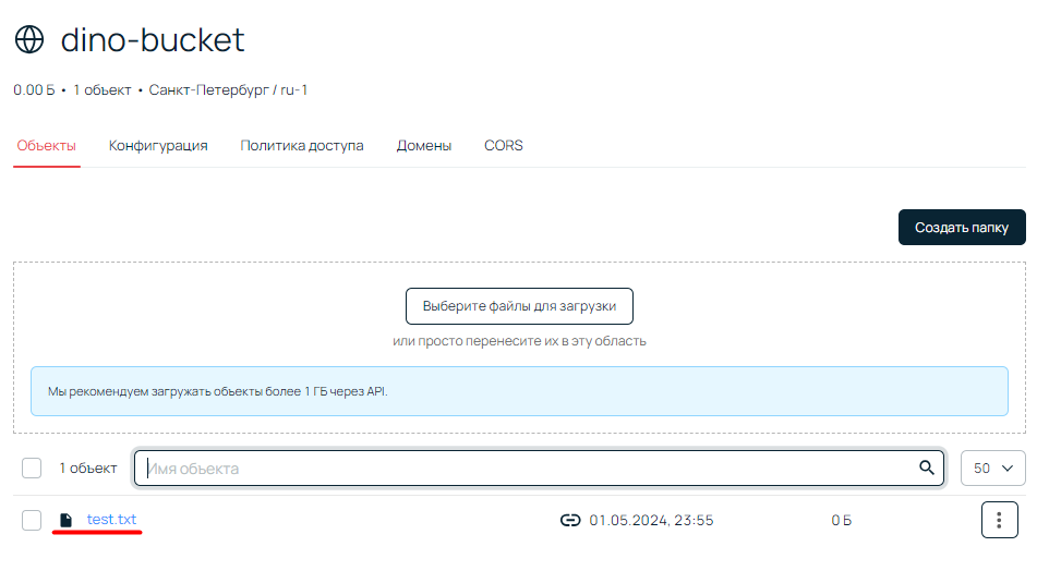 Выполним команду для загрузки файла test.txt в контейнер dino-bucket с использованием пользователя selectel: