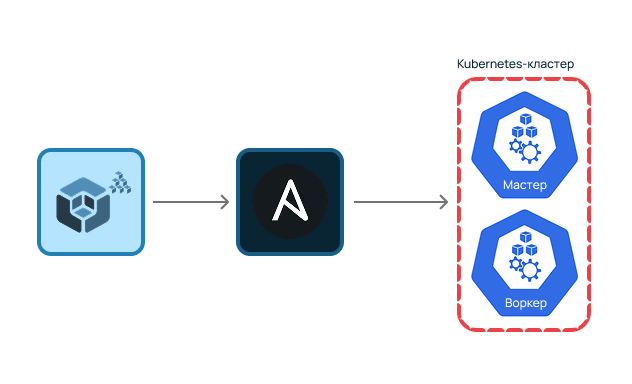 Что мы здесь видим? Первое — вспомогательную ВМ, на которой у нас будет установлен Ansible. Это может быть также ваш локальный хост. Тестовый кластер же будет состоять из одной мастер-ноды и воркер-ноды.