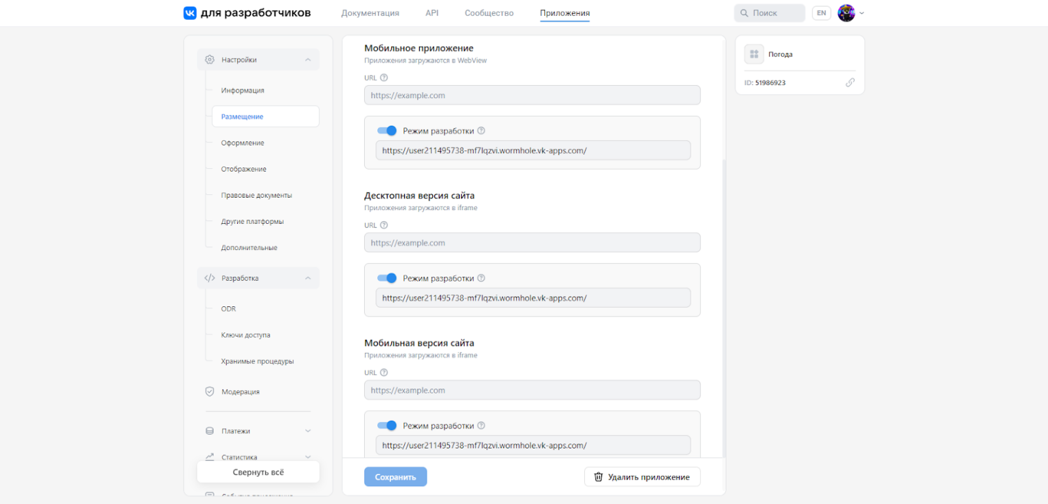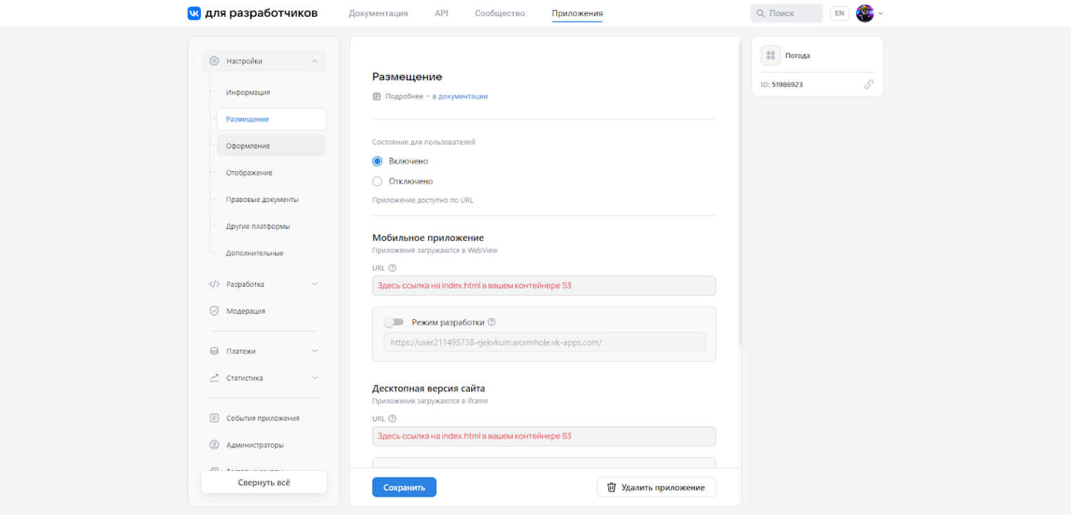 4. Возвращаемся в панель управления мини-приложением и переходим в раздел Размещение. В подразделе Состояние для пользователей выбираем Включено. В остальных подразделах проставляем ссылку на файл index.html и выключаем режим разработки. Сохраняем настройки.