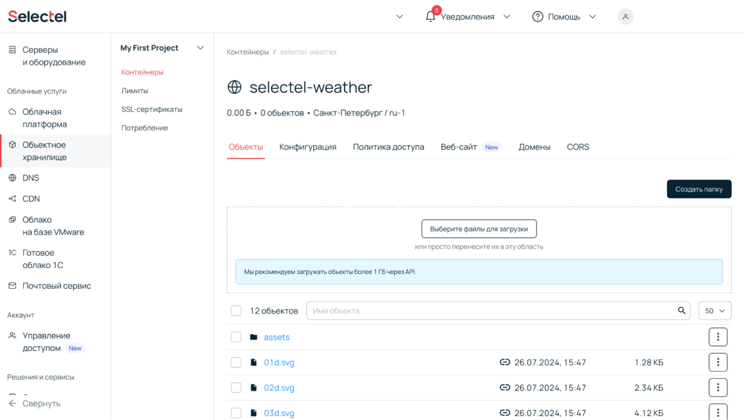 1. Авторизуемся в панели управления и переходим в раздел Объектное хранилище.