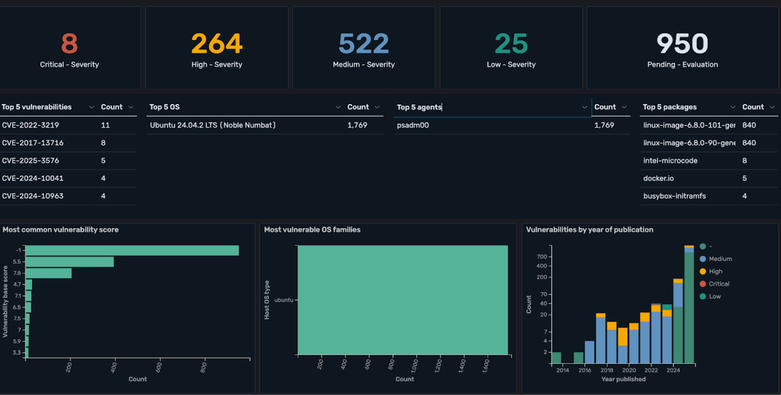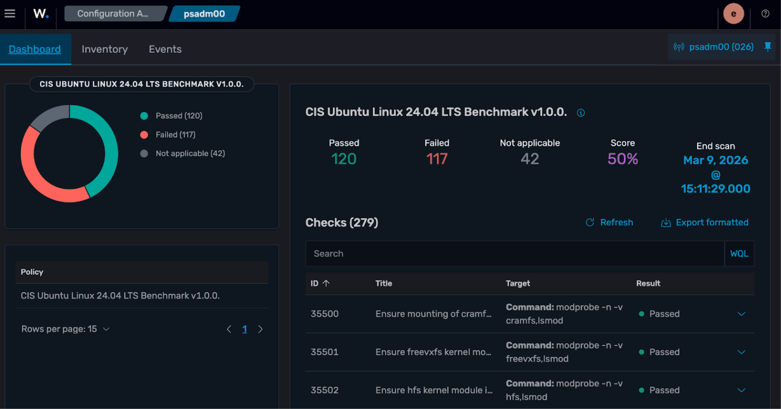Проверяет конфигурацию хостов на соответствие политикам безопасности. Политики описываются в YAML и покрывают стандарты (CIS Benchmarks, PCI DSS, HIPAA) или собственные требования.Каждая проверка возвращает статус passed / failed / not applicable . Результаты агрегируются на дашборде в виде итогового процента соответствия по каждому хосту.