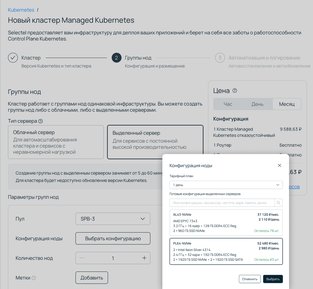 В Managed Kubernetes on Bare Metal воркер-ноды разворачиваются на базе выделенных серверов. При этом Control Plane с мастер-нодами остается в облаке. Вам нужно только выбрать конфигурацию выделенного сервера и создать кластер. Все сетевые настройки, включая настройку глобального роутера (L3VPN), будут выполнены автоматически.