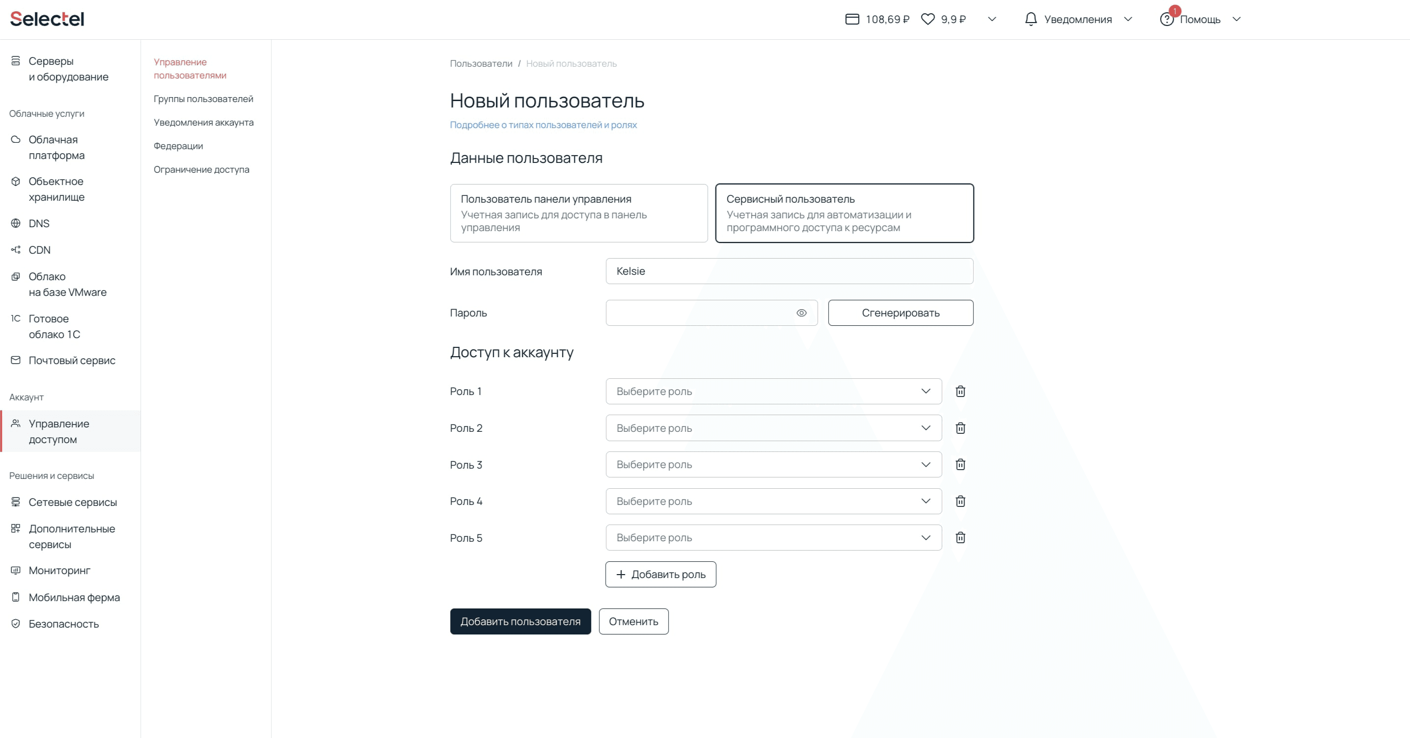 - Разграничение ролей и доступовЗадайте сотрудникам роли и определите уровни доступа: к конкретным ресурсам, проектам, всему аккаунту или только к информации о биллинге.В панель